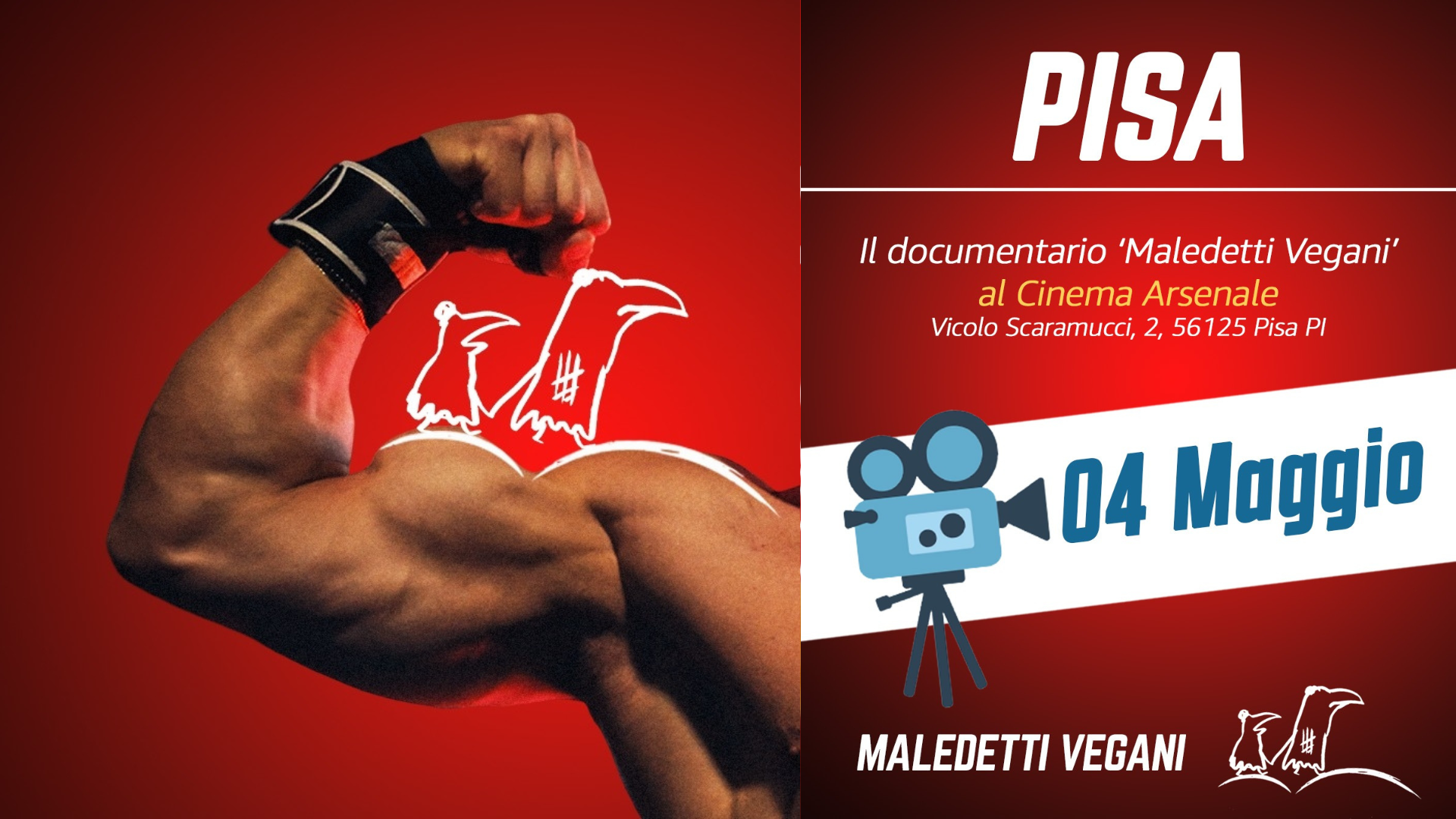 La proiezione di Maledetti Vegani a Pisa si terrà Lunedì 4 Maggio presso il Cinema Arsenale, uno spazio da sempre attento al cinema indipendente e ai temi contemporanei.